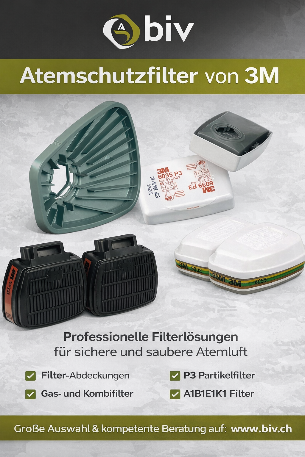 Hochwertige Produktdarstellung von 3M Atemschutzfiltern bei Bau & Industrie Vertrieb GmbH. Das Bild zeigt verschiedene Filter- und Kombinationslösungen für zuverlässigen Atemschutz in Industrie, Bau und Handwerk. Abgebildet sind Partikelfilter, Gas- und Kombifilter sowie passende Filterabdeckungen für sichere und saubere Atemluft. Ideal für professionelle Anwendungen mit hohen Anforderungen an Sicherheit, Komfort und Qualität. Eine umfassende Auswahl für den Einsatz in staub- und gasbelasteten Arbeitsumgebungen.